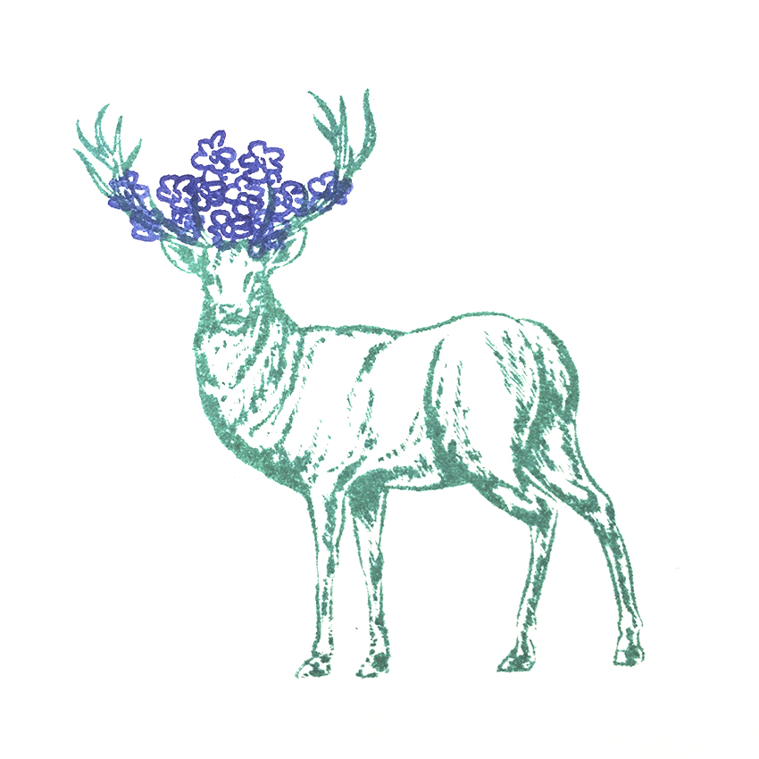 Hirsch mit blauen Blumen